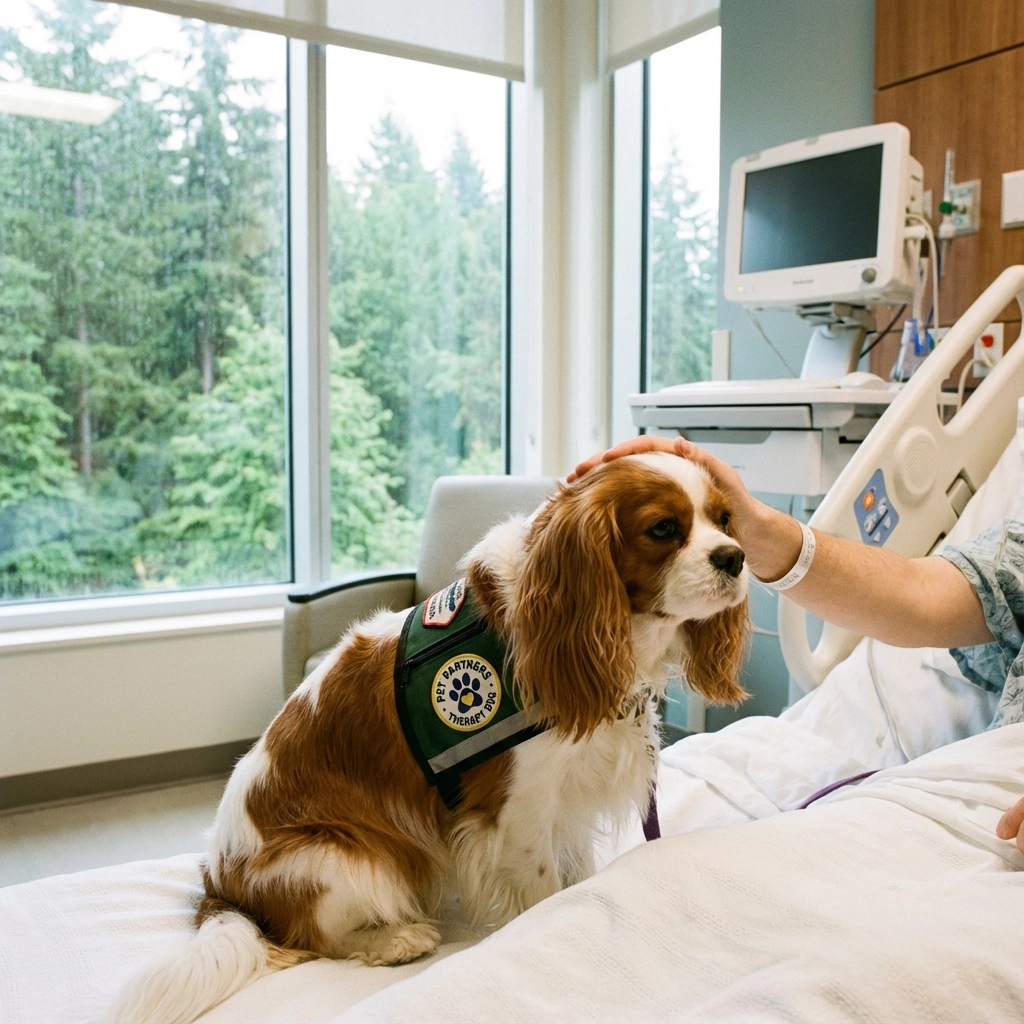 Throughout Portland metro, Salem, and Central Oregon, families are discovering the incredible impact their Cavalier therapy dogs make in their communities. One beloved companion named Sophie visits Providence Portland Medical Center weekly, providing comfort to pediatric patients and their families.